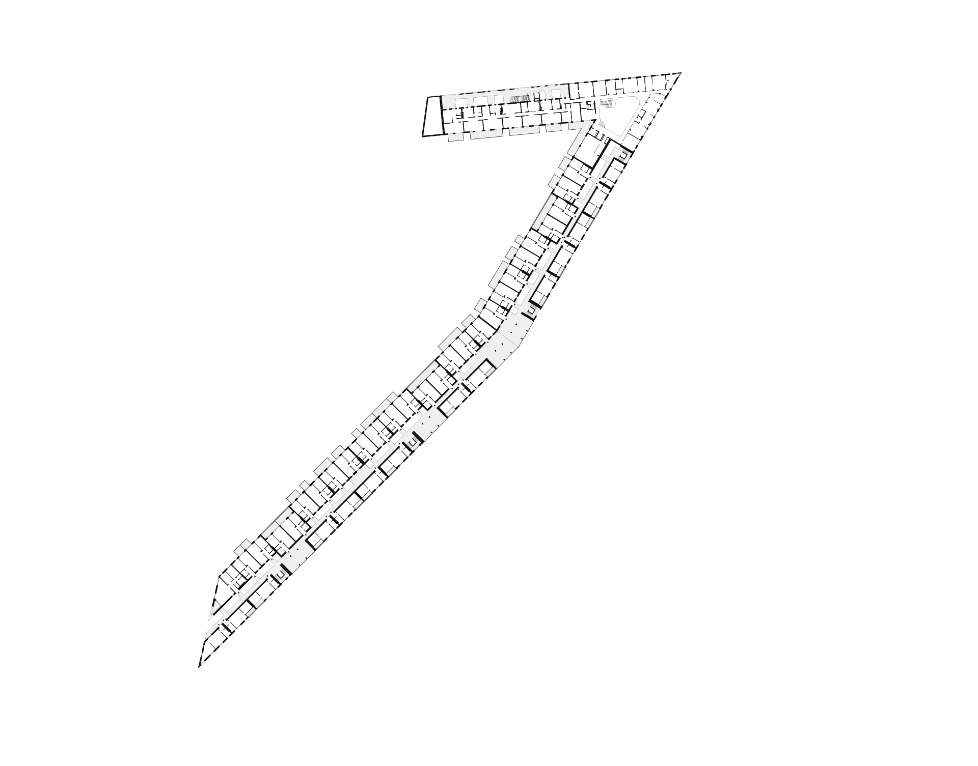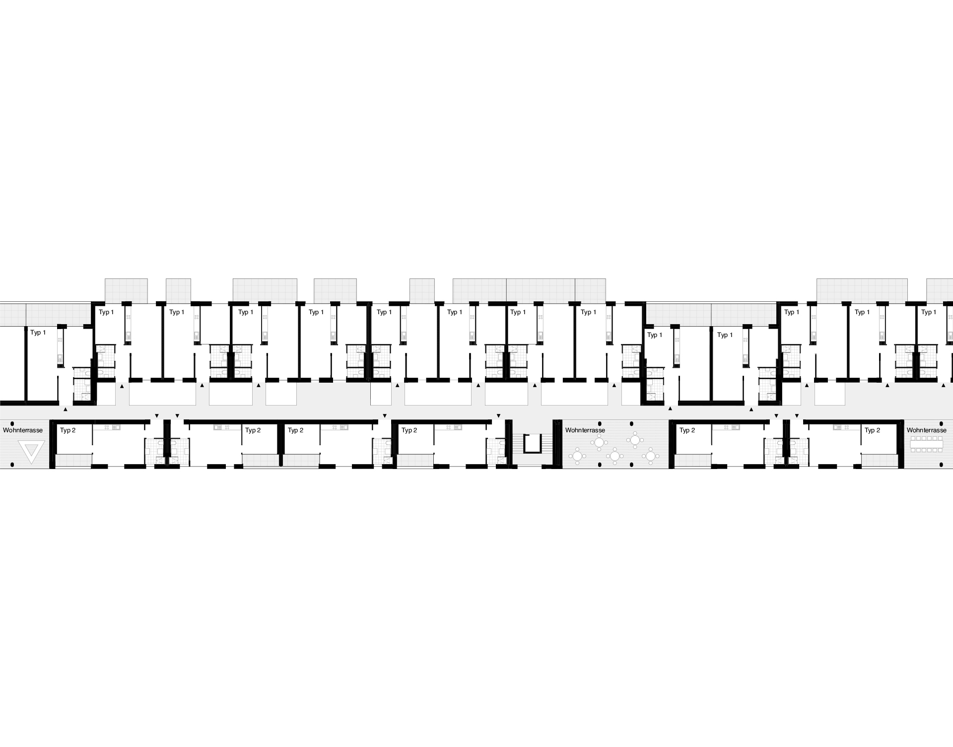 Am Südspitz wird die innen liegende Laubengangerschließung sichtbar.
