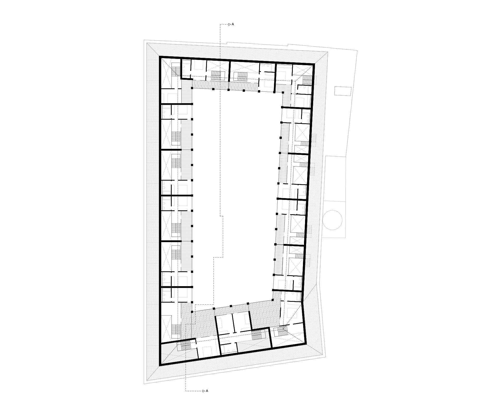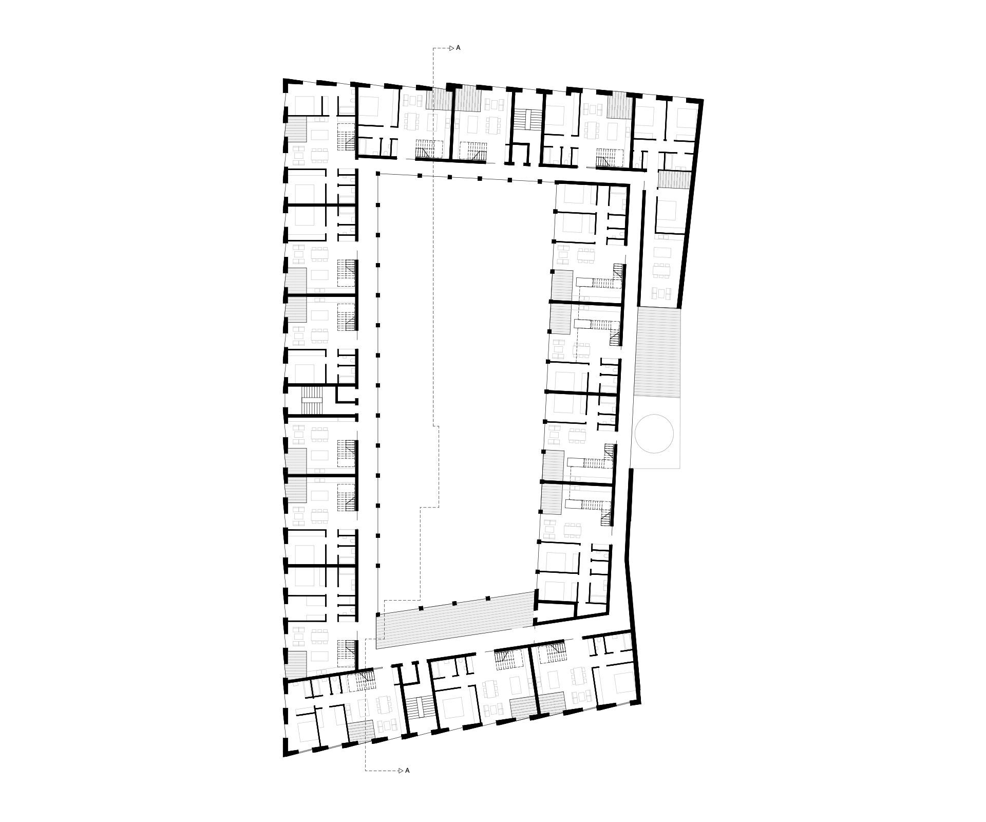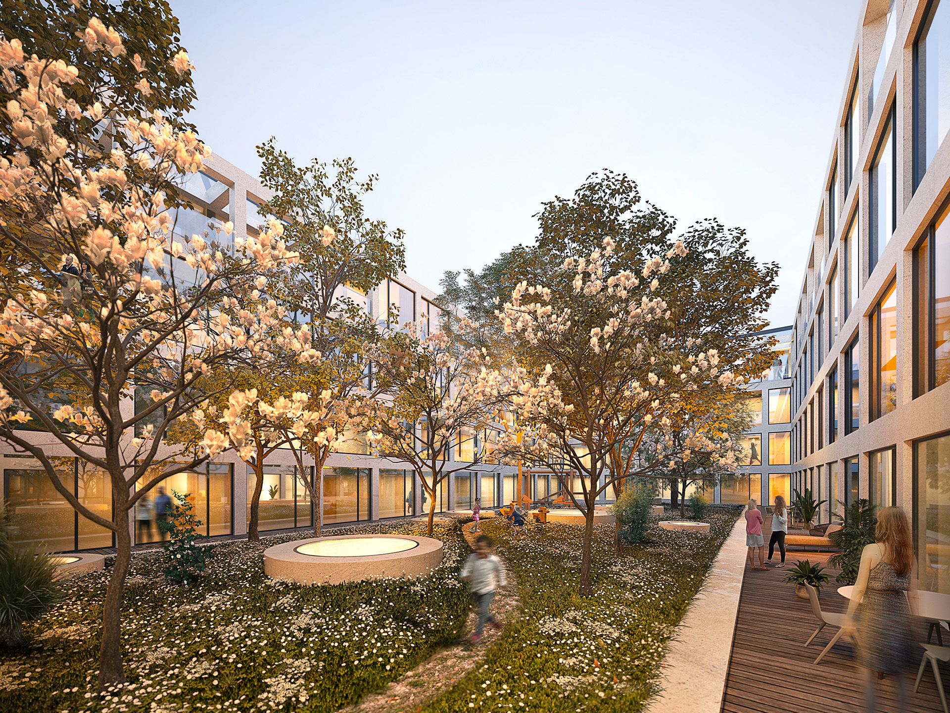 The chosen courtyard typology not only creates a self-contained, high-quality open space in the courtyard, but also offers organizational advantages. The ring-shaped access keeps distances short and adds communicative value for both the hotel and the apartments.