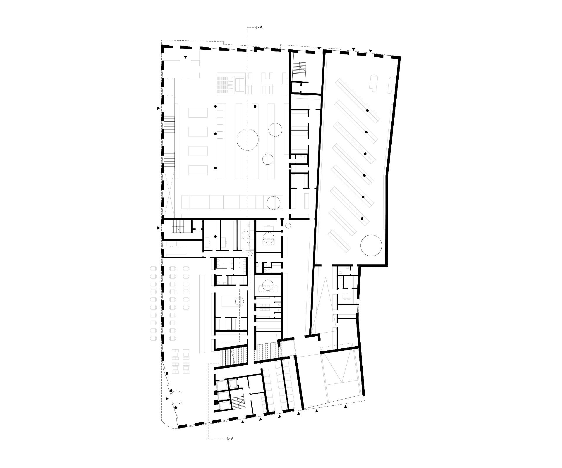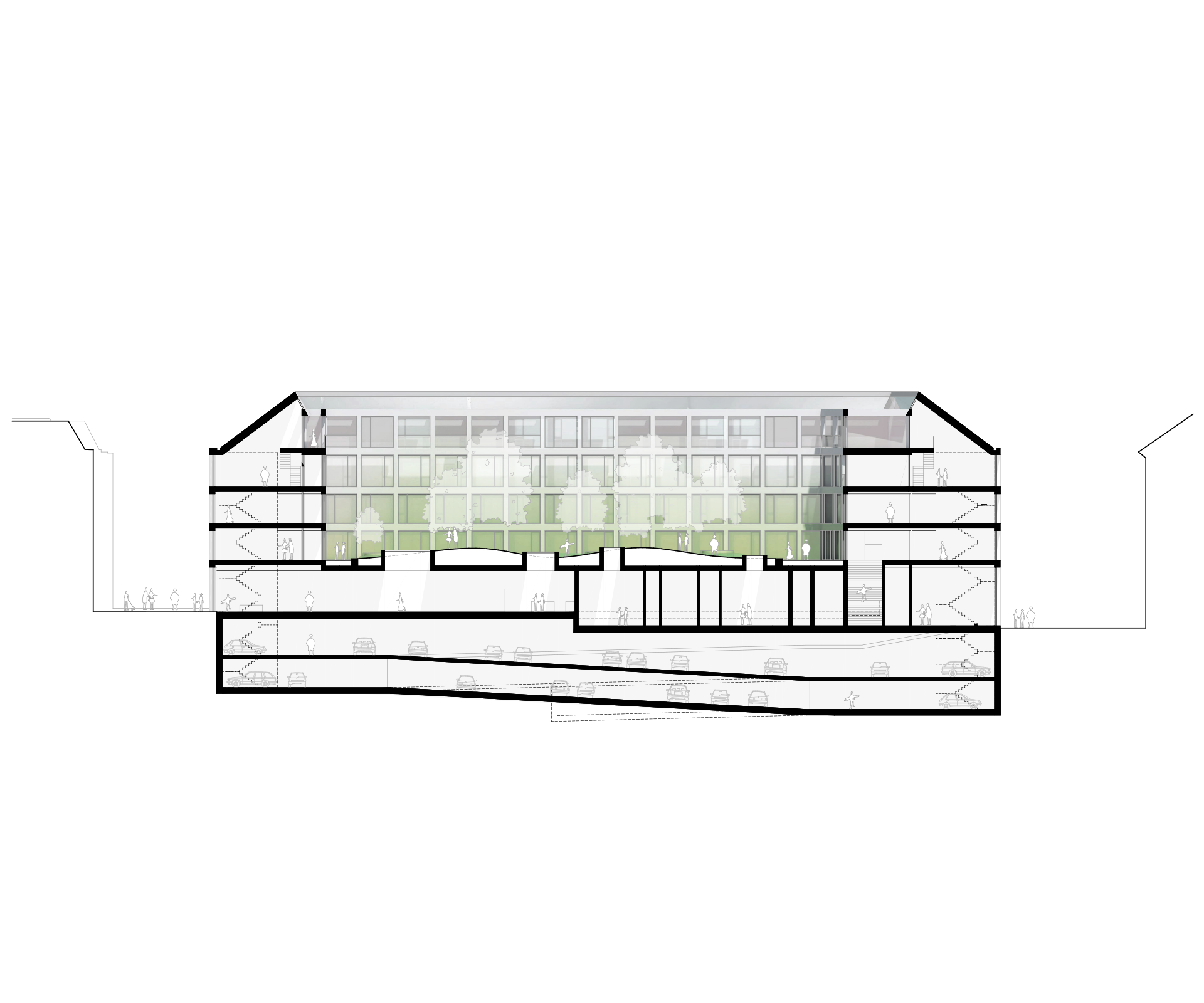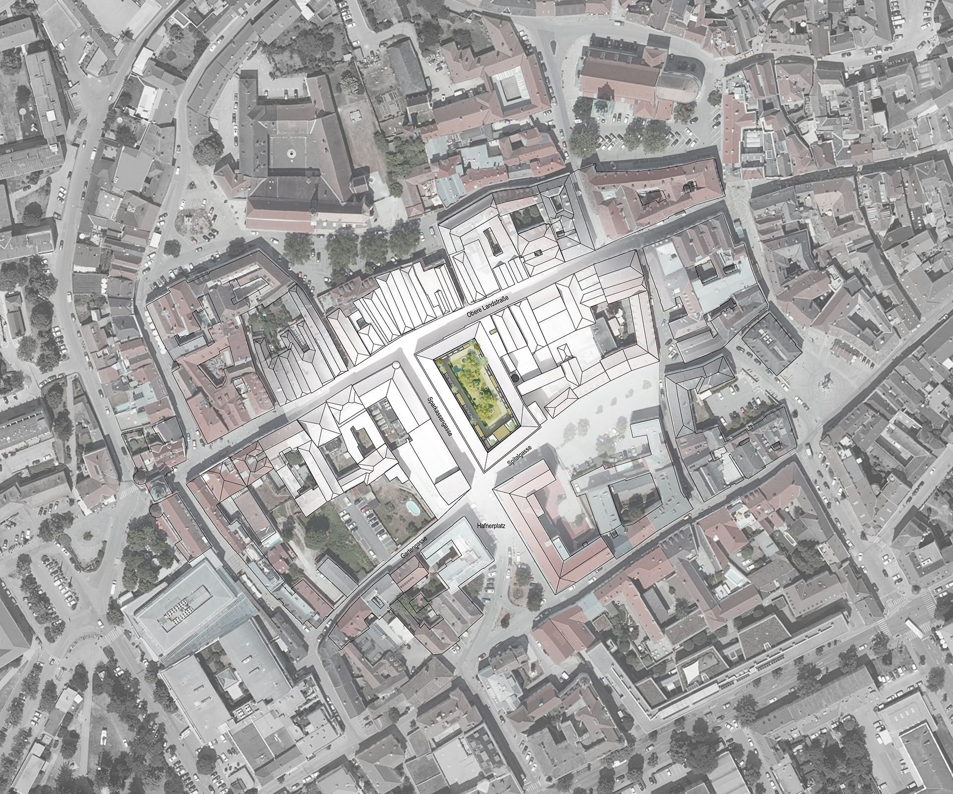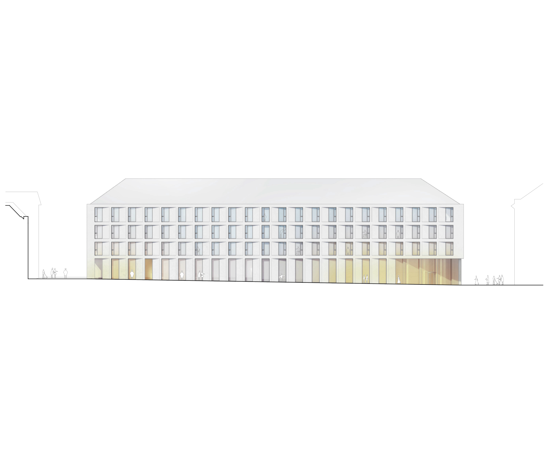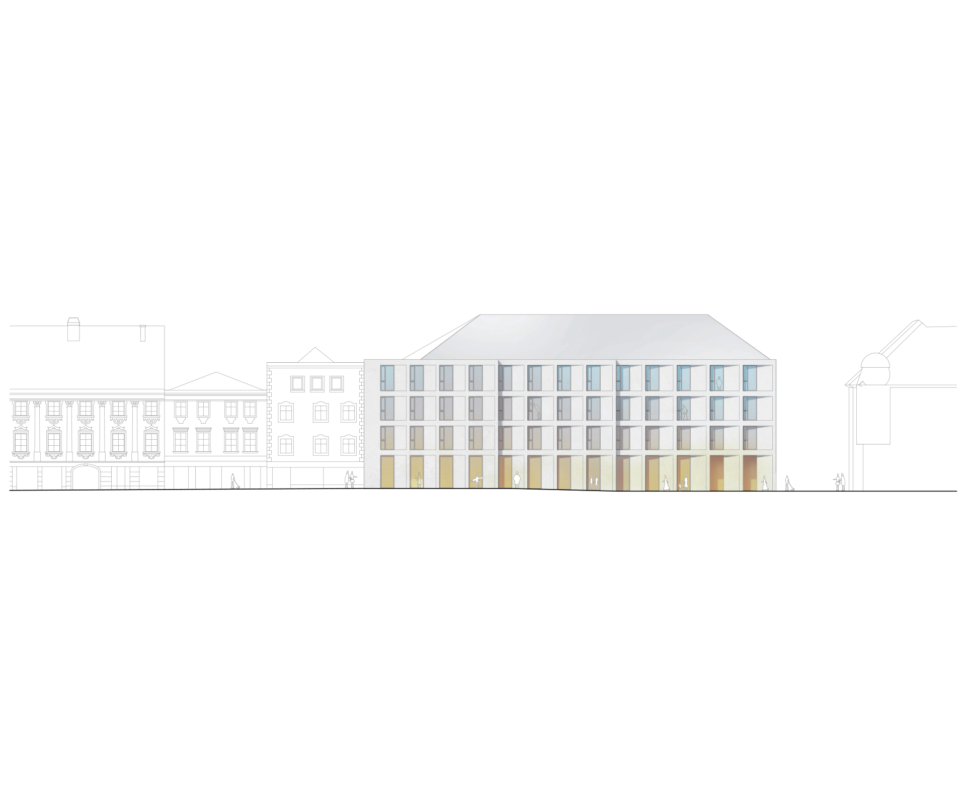In Sparkassengasse, the direction of the window reveals changes in the middle of the street, dividing the facade of Sparkassengasse into two sections in reference to the two existing buildings that are to be demolished.The roof of the building is proposed as a pitched roof with gray Eternit covering in order to harmoniously embed the new building into the historic fabric.