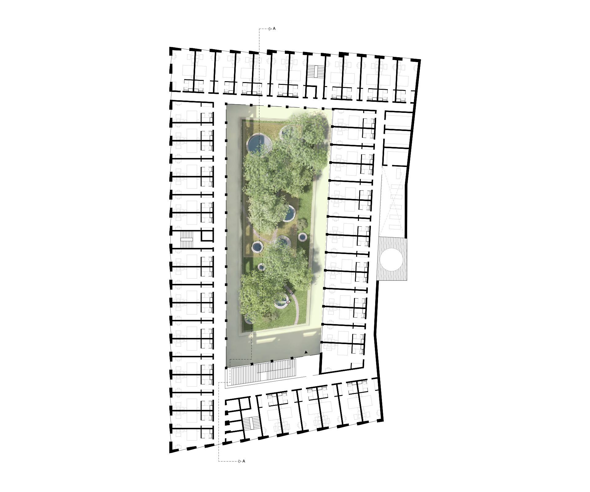 In contrast to the solid exterior facades, the facades of the green inner courtyard are filigree and transparent – here, the corridors and rooms of the hotel on the first and second floors surrounding the inner courtyard and the apartments above on the third floor communicate intensively with the central green space. On the first floor, the elevated courtyard can be accessed directly from the hotel corridors and rooms as an extended lounge area for guests.