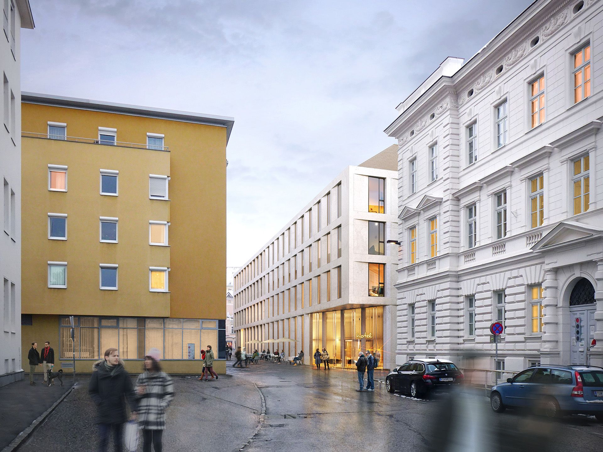 The entrance to the hotel opens onto Hafnerplatz (in the foreground), while Sparkassengasse (on the left) is enlivened by a bar in the hotel lobby.