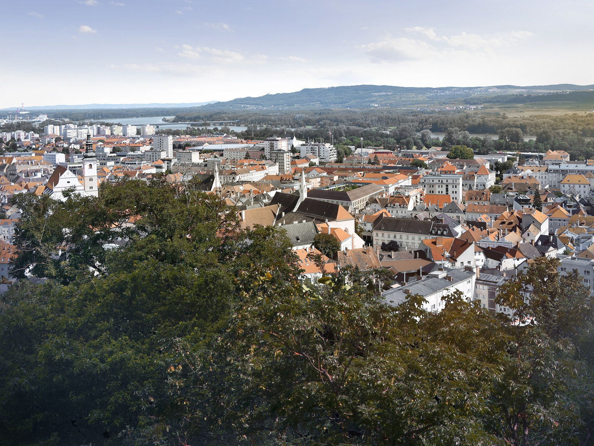The new hotel building (center of photo) blends harmoniously into the rooftop landscape of Krems's old town.