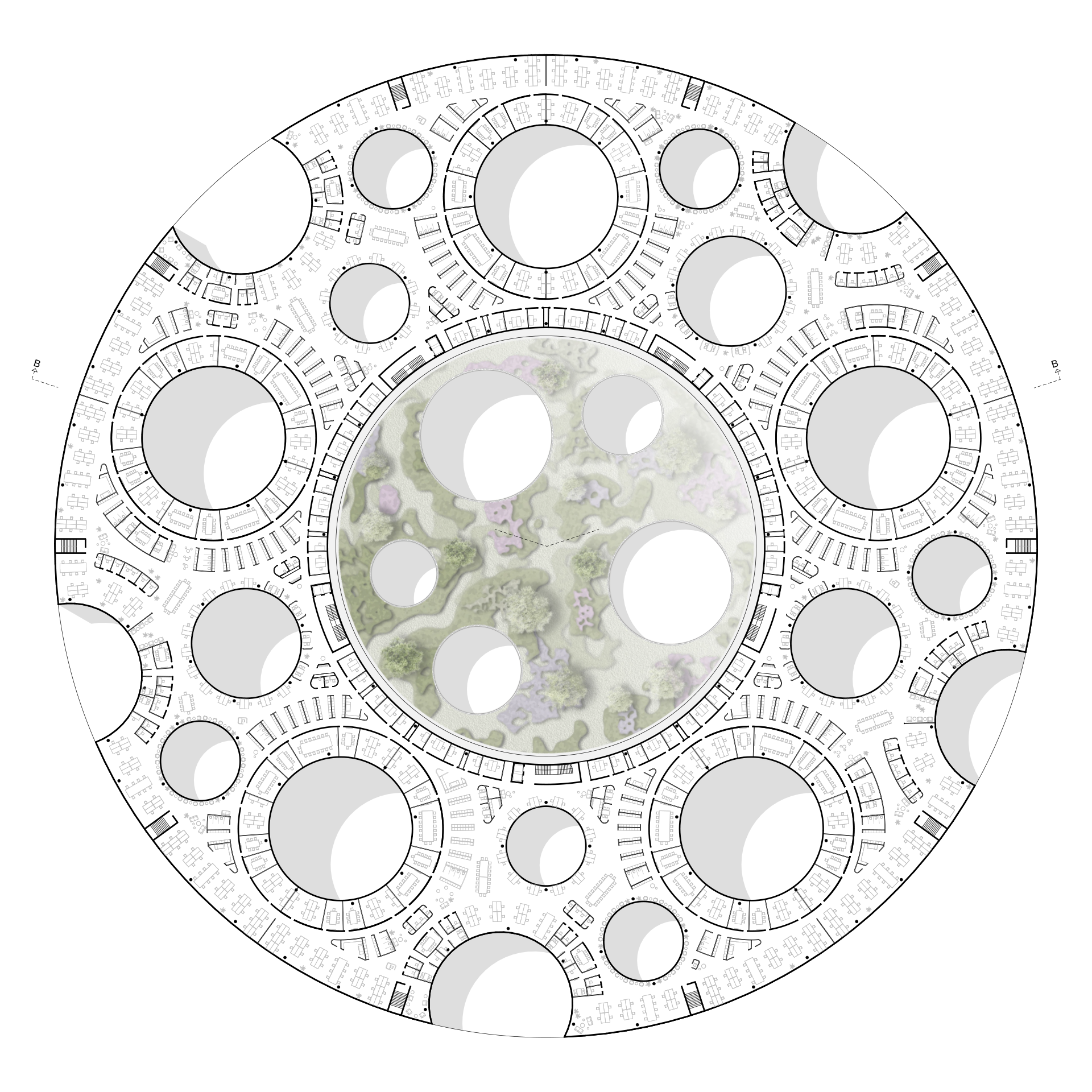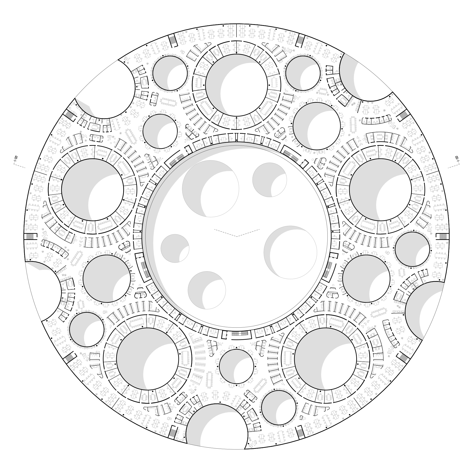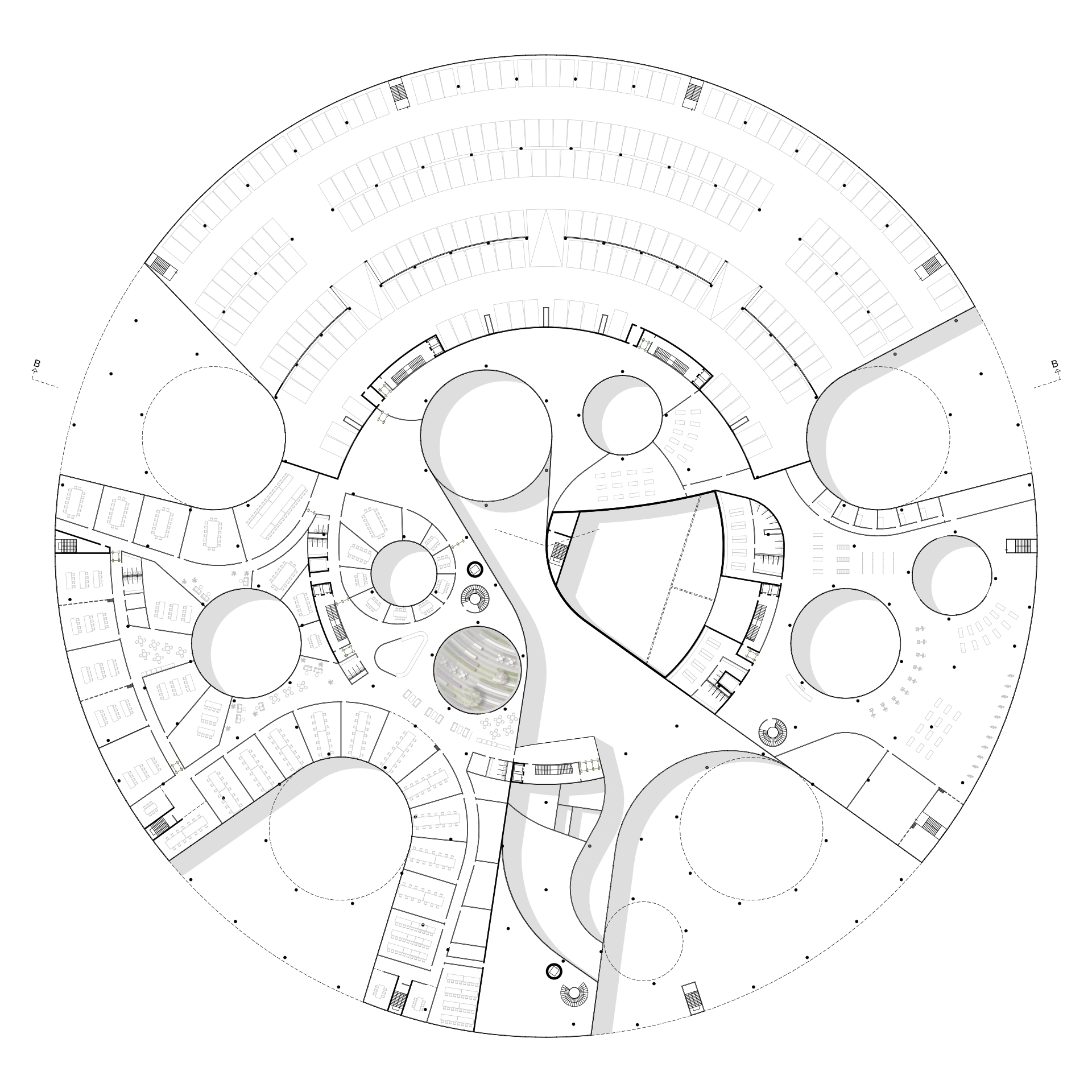 Based on this organisational diagram, a solitaire is proposed that provides a confident response to both the complexity of the internal organisation and the urban planning situation on the outskirts of Nuremberg. Its simple yet generous basic form – a circle with a diameter of 180 metres – creates an unexpected sense of calm in its changing suburban surroundings and remains in the memory of those passing by on the nearby motorway as a memorable logo. At the same time, the circular building directly reflects Datev's innovative office concept.