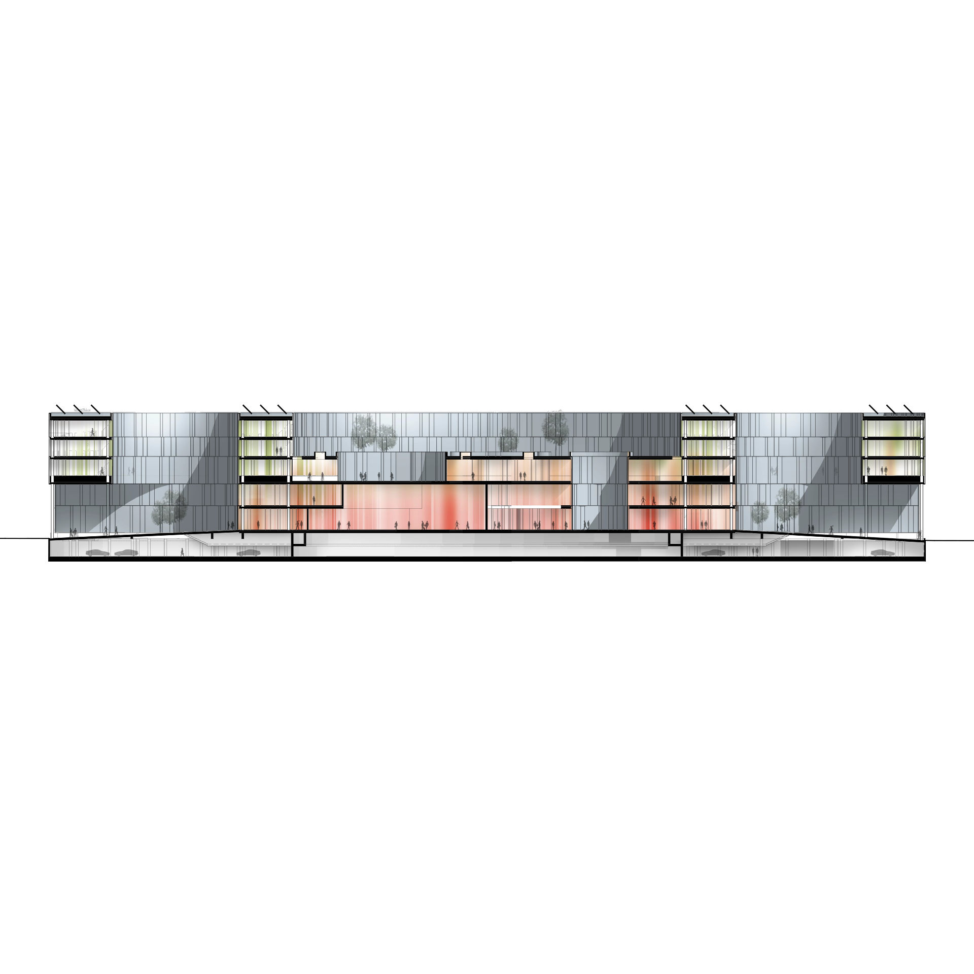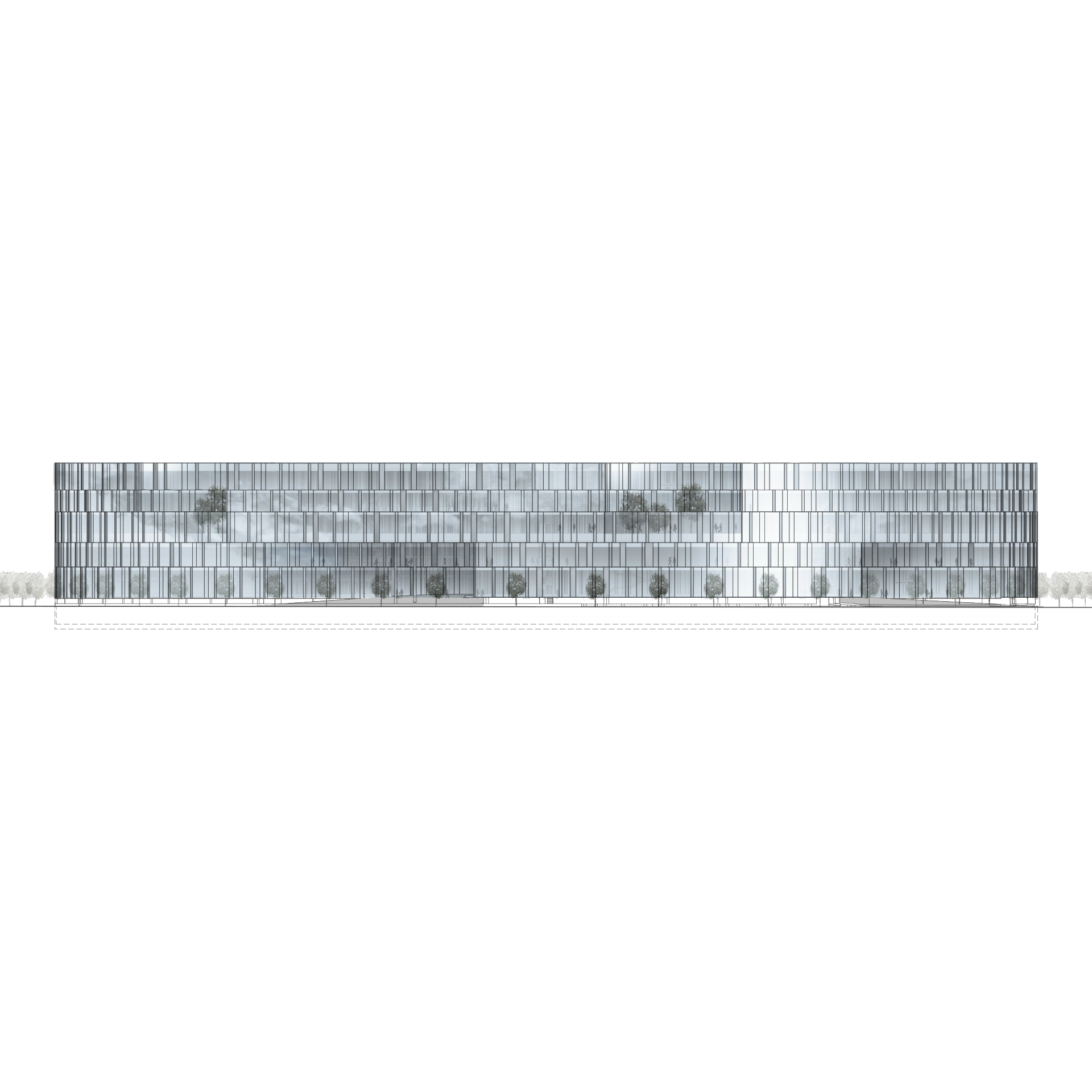 The patios create open spaces that are directly accessible from the building and are equipped with a differentiated open space concept, each with its own distinct identity. The open space concept is continued in the design of the open spaces around the building, which are being developed as an innovative hybrid between a park and a car park.