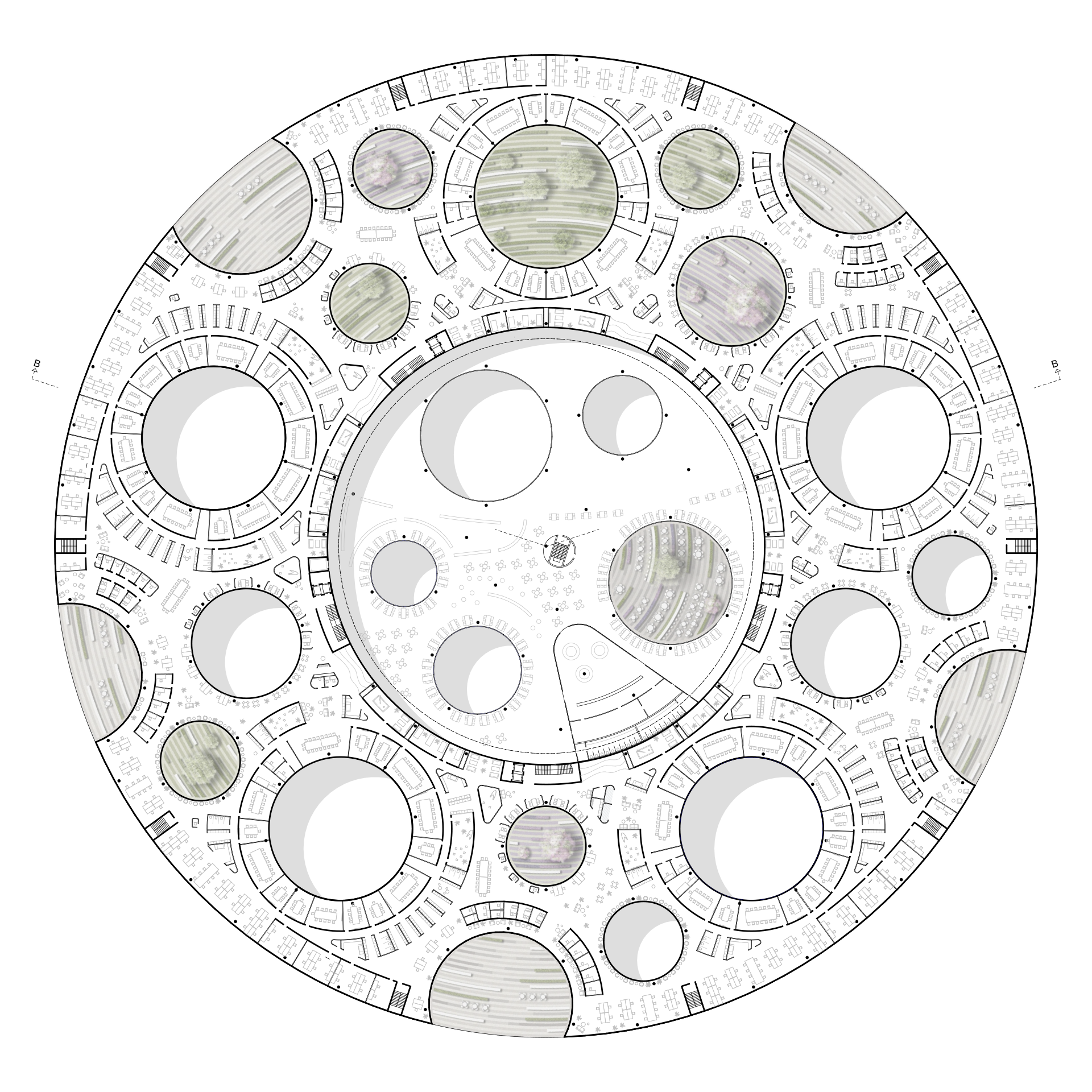 To surround the multifunctional mega-hub, which extends from the ground floor to the second floor and contains numerous public and semi-public areas (co-working, conference, event and exhibition spaces, learning environments, retail, catering, fitness centre), the home zones are arranged concentrically from the second floor upwards and can be reached quickly via the midi hubs and hubs. The ring-shaped arrangement of the midi hubs allows direct routes from one midi hub to the next, and cross-connections between midi hubs are also possible via the mega hub.