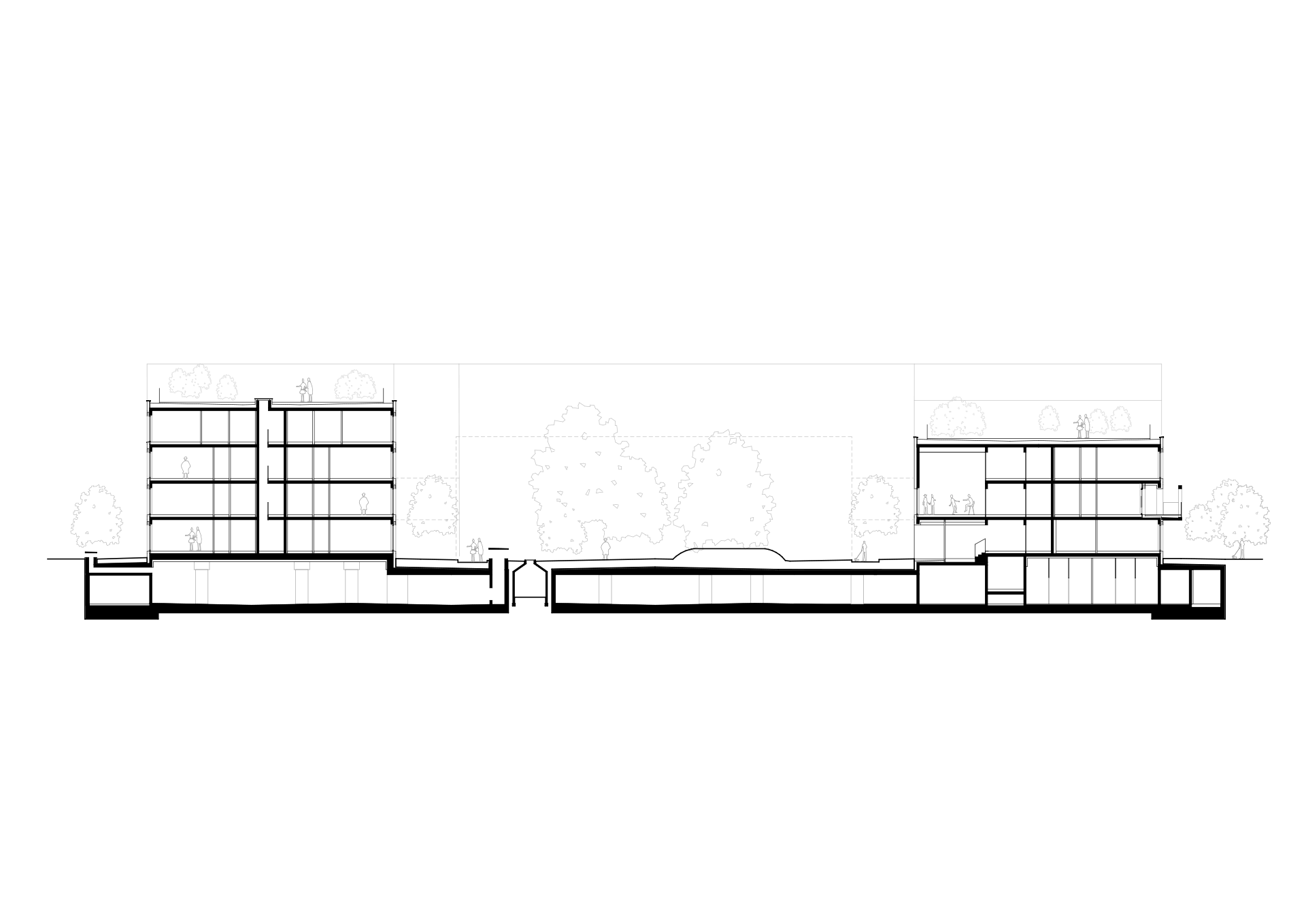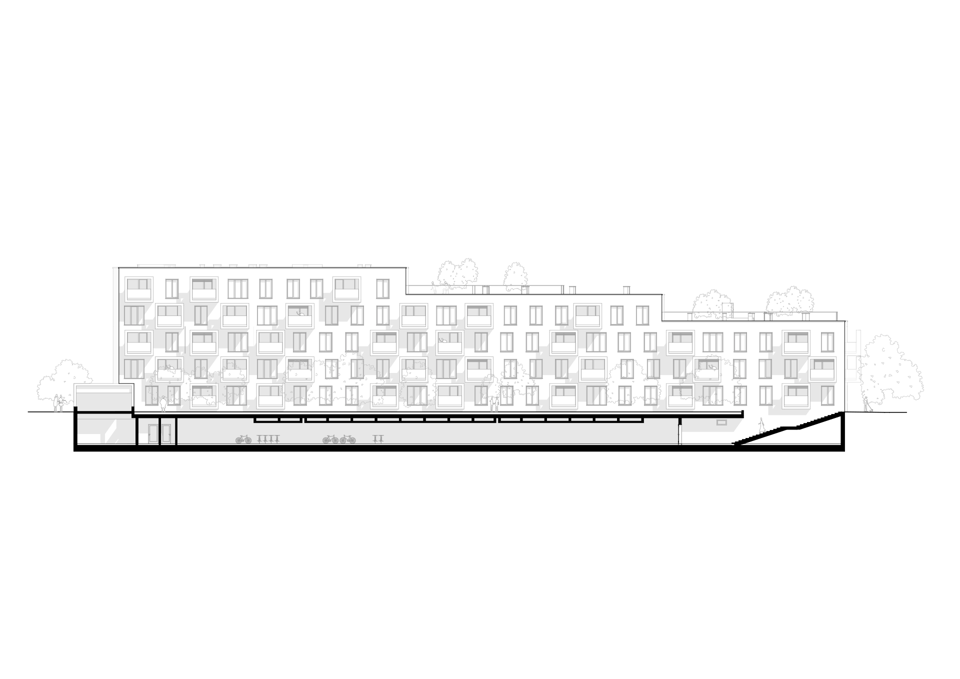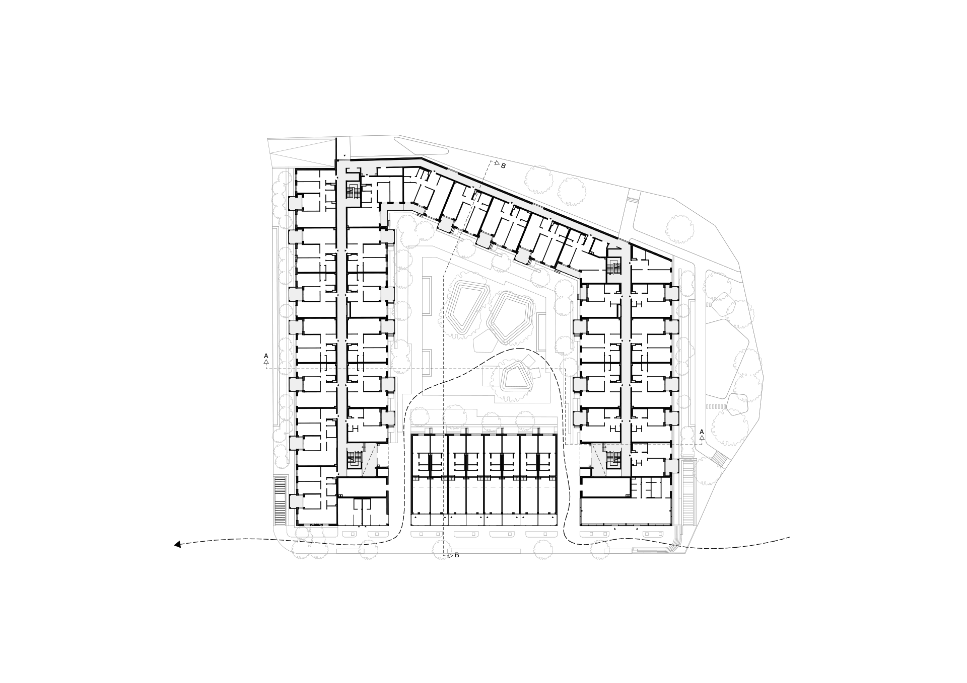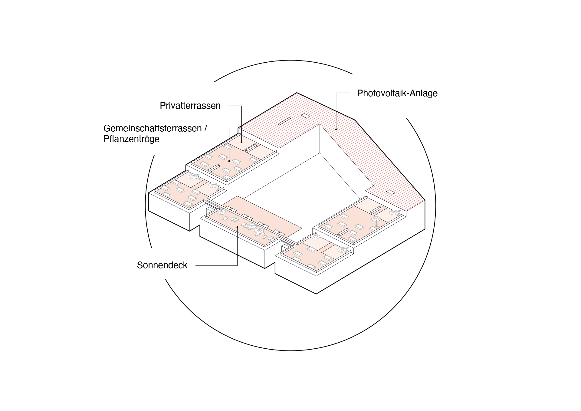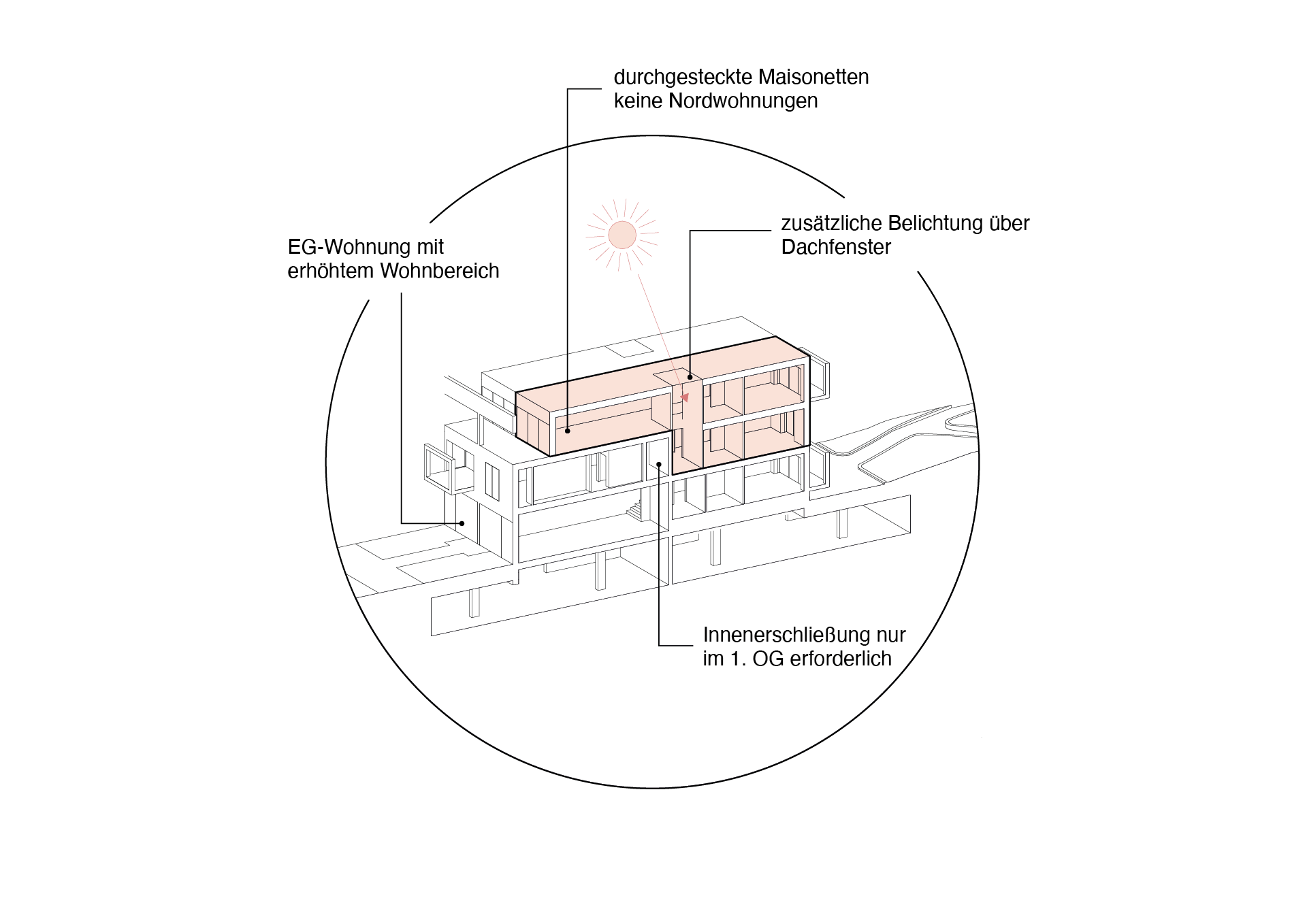 While the main building consists exclusively of single-story apartments, the freestanding building to the southwest features duplex apartments to avoid having apartments that face only northeast. Skylights in the roof provide these duplexes with natural light down to the entrance floor. The use of maisonettes also makes it possible to reduce the access areas in the detached building to a minimum: while the apartments on the ground floor are accessed directly from the outside, the apartments above are accessed via a single corridor on the first floor.