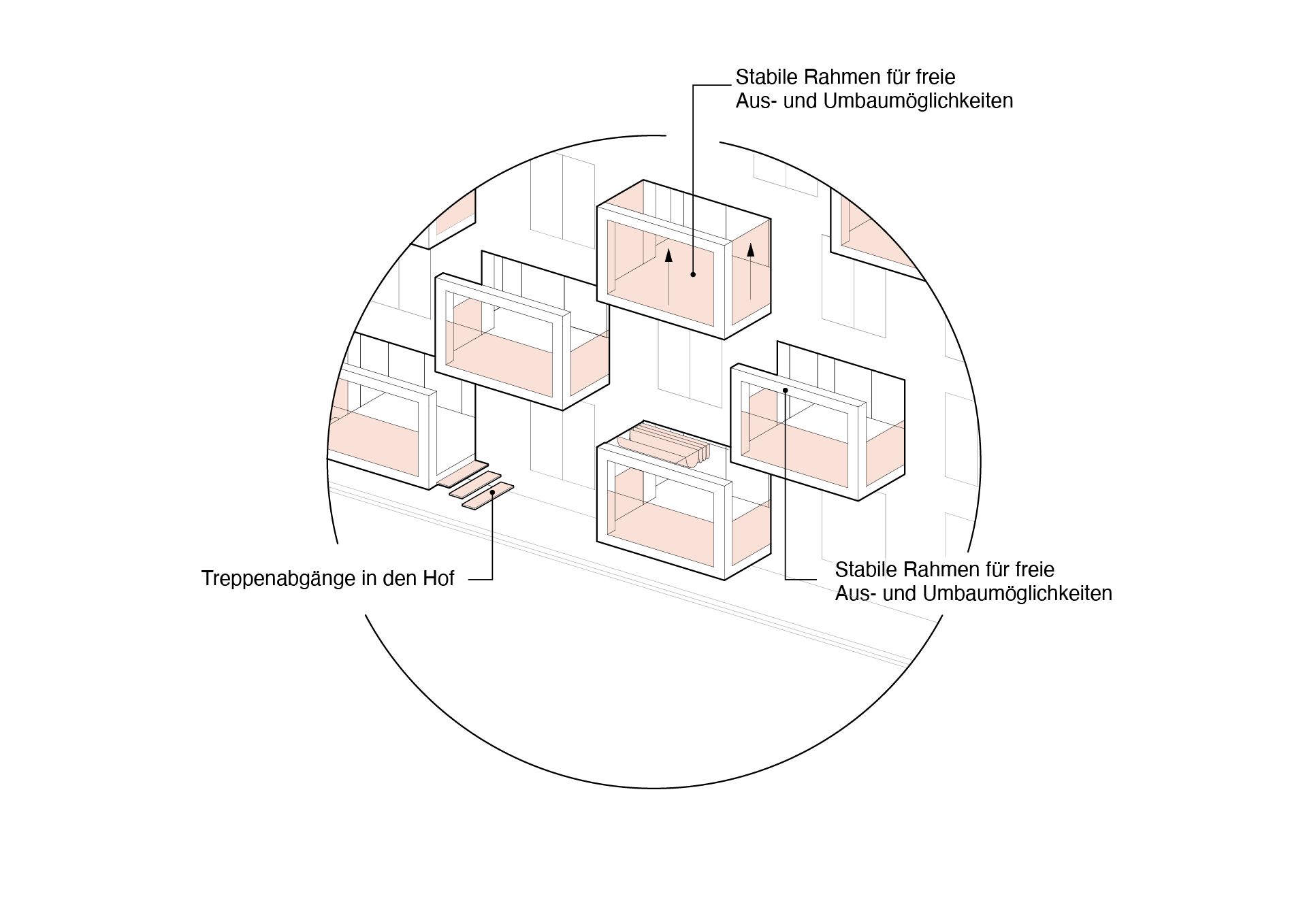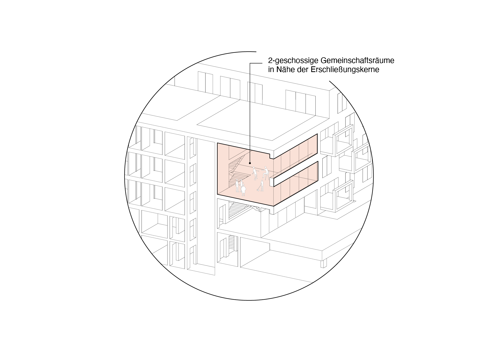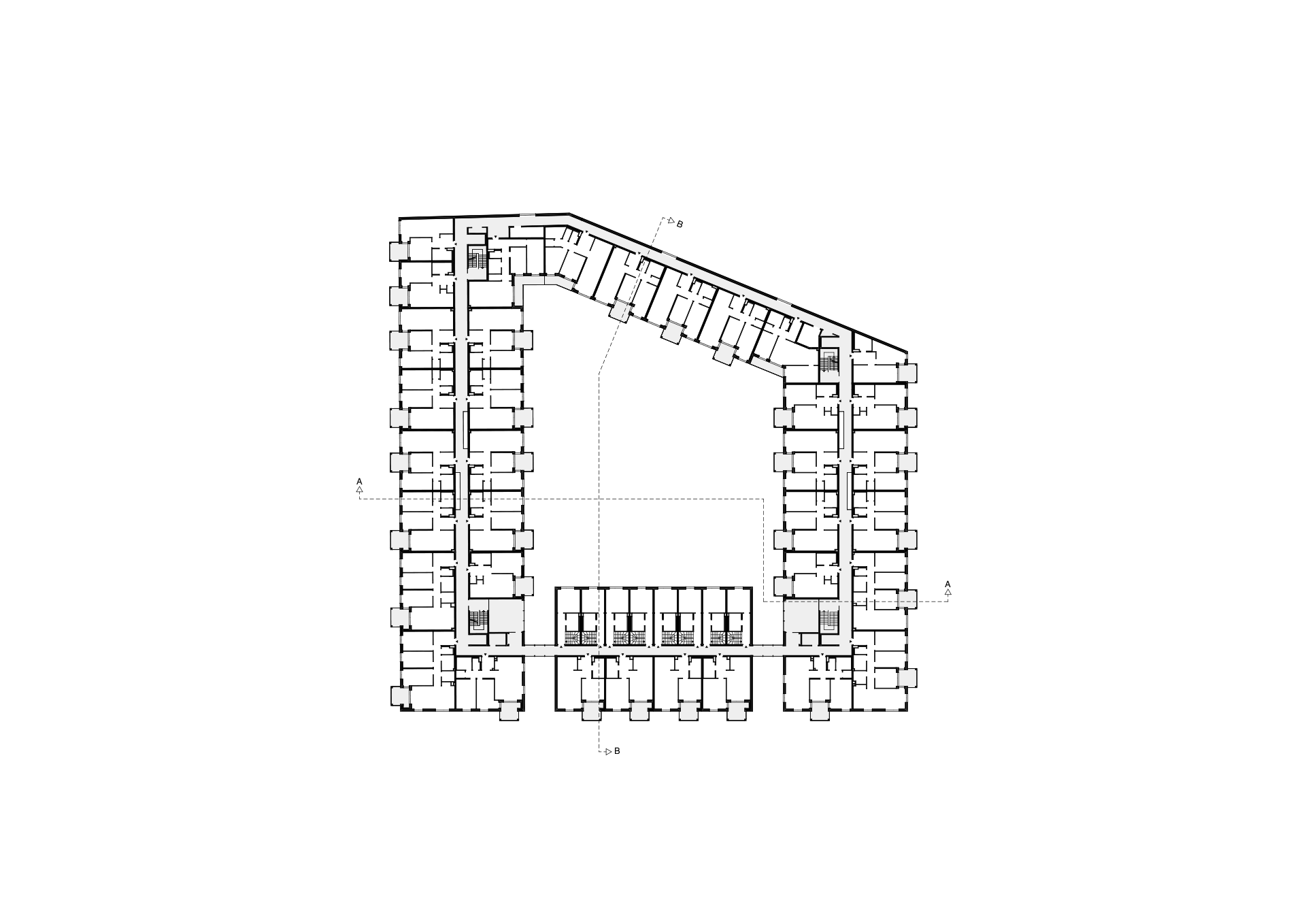 The apartments are accessed via four stairwells in the inner corners of the perimeter block development. Alternating light openings in the interior corridors of the northwestern and southeastern wings of the main building divide the corridors spatially, bring daylight into the lower floors, and create visual connections across floors.