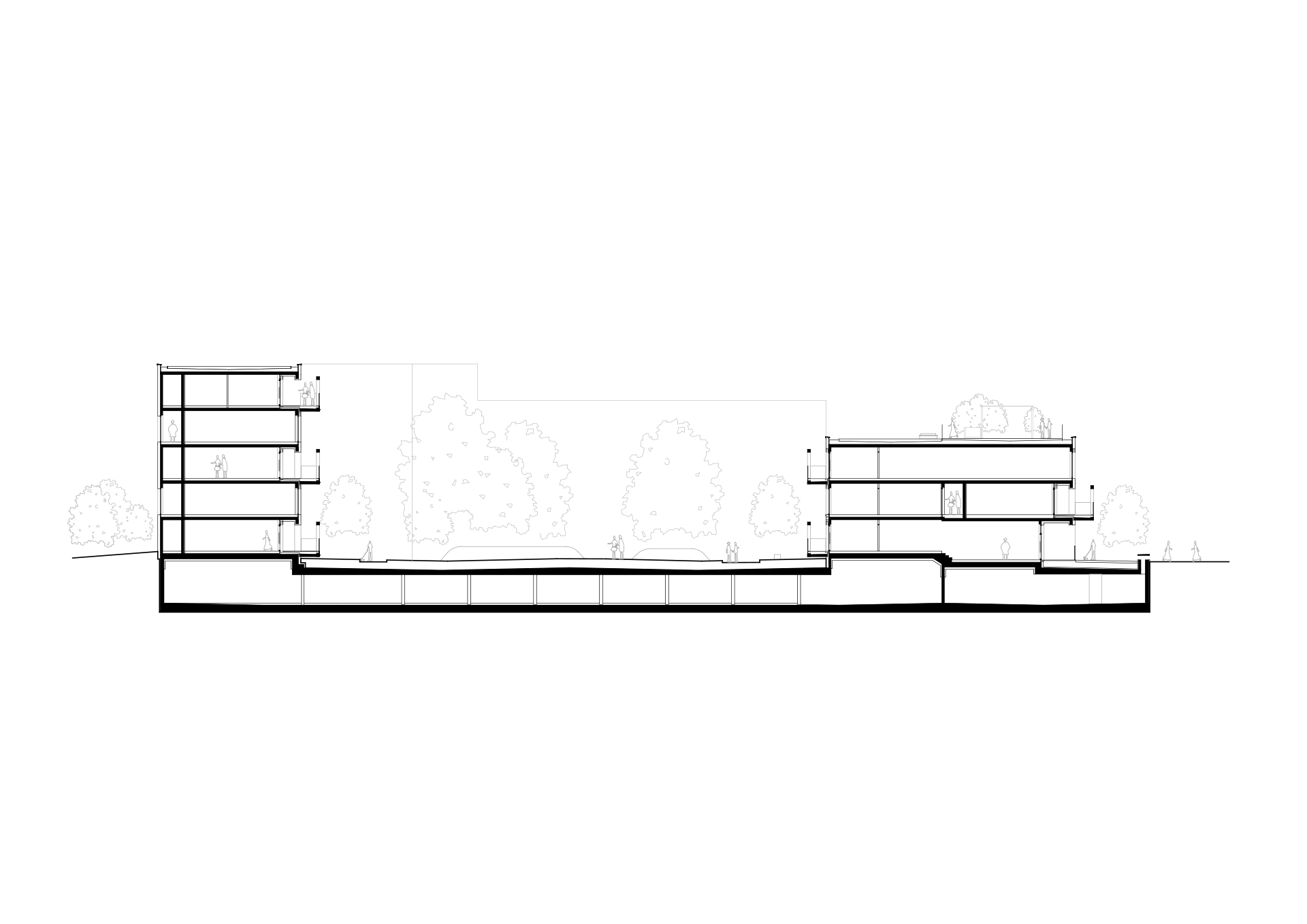 Big is beautiful in Graz residential and commercial building is a commitment to high-quality urban densification. The existing, heterogeneous urban space is being spatially reorganised, with plaza-like extensions and a spacious, publicly accessible neighbourhood park. Inside the building itself, a dozen residential terraces can be used communally by all residents of the building. This strengthens neighbourly communication and social interaction