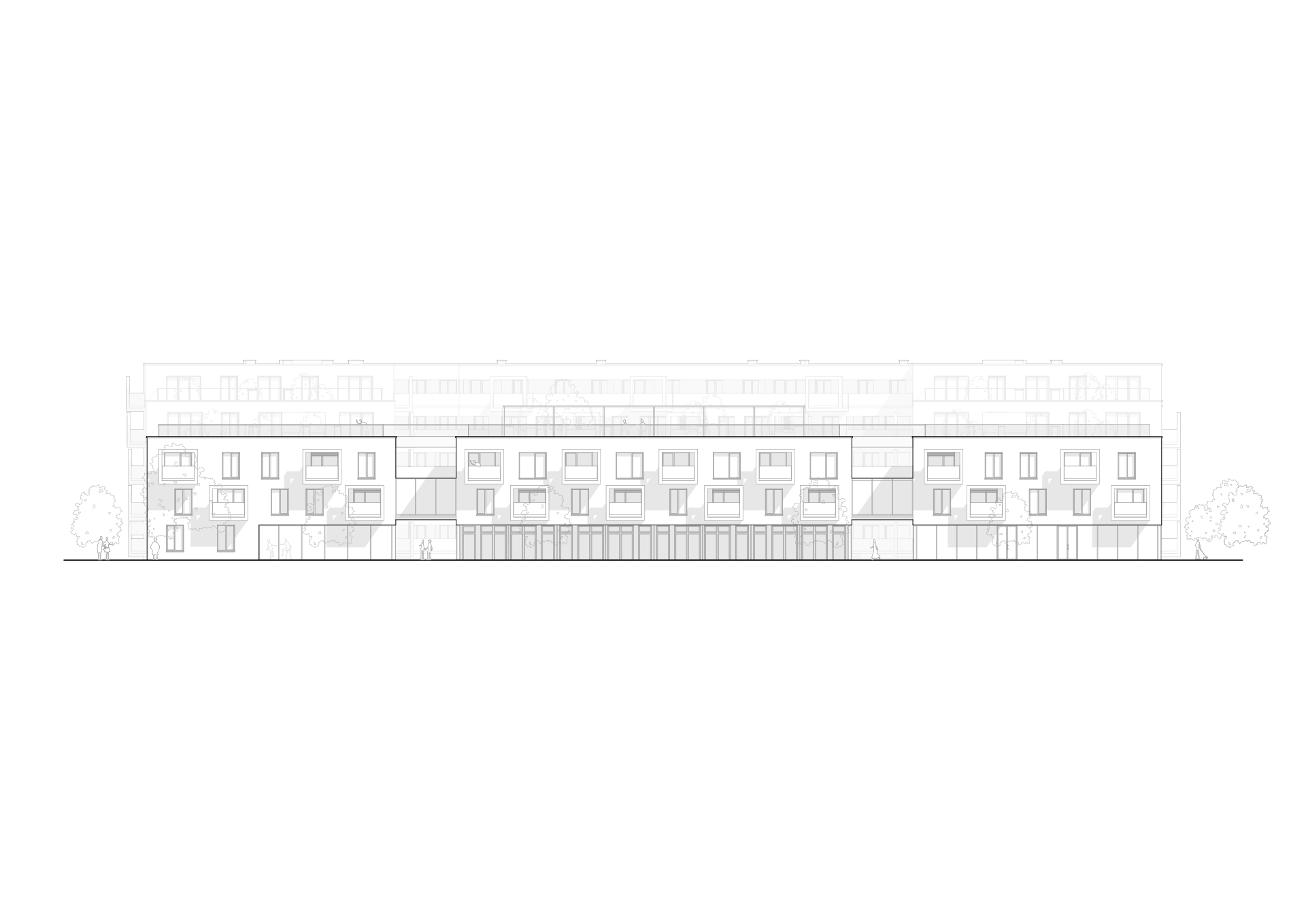 The external appearance is defined by warm-toned façades and a relaxed façade structure with a lively arrangement of loggias and adjoining balconies. Private loggias and balconies are accessible from the living room and up to two large rooms, allowing a maximum number of rooms to benefit from private outdoor space. The balconies are enclosed by solid frames (“viewing windows”), giving the entire complex a distinctive appearance. In ground-floor apartments, the balcony is equipped with a staircase leading down to the courtyard. Due to the abundance of natural spaces in the immediately adjacent Danube floodplains, the focus of the green and open spaces near the buildings is on park-like and paved open spaces that are used communally and semi-publicly. Public open spaces towards the promenade will be paved, while in the remaining outdoor areas and in the inner courtyard, green spaces will alternate with dust-free, permeable surfaces.