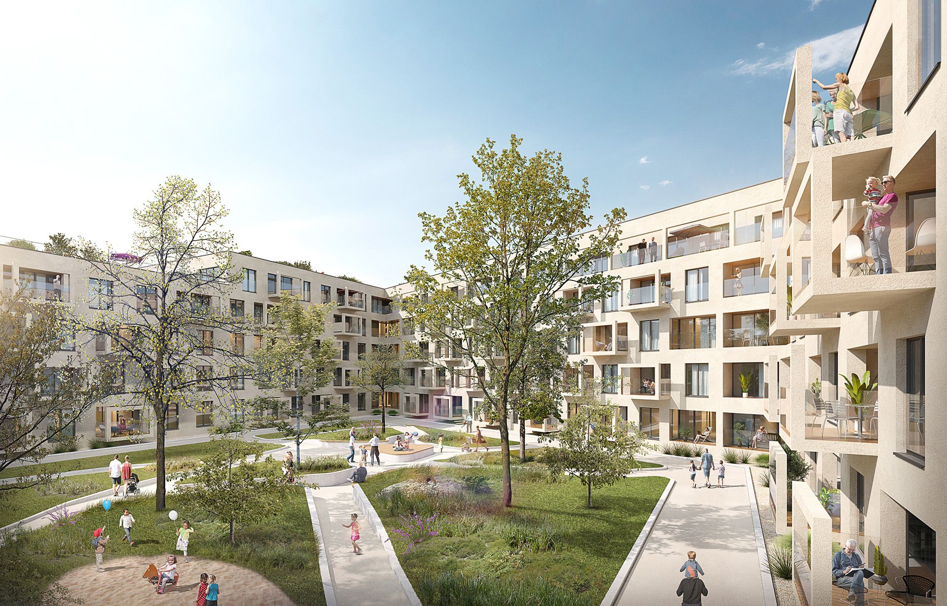 High-quality open spaces, a diverse range of paths, squares and communal areas: Werft Zirkuswiese residential complex in Korneuburg
