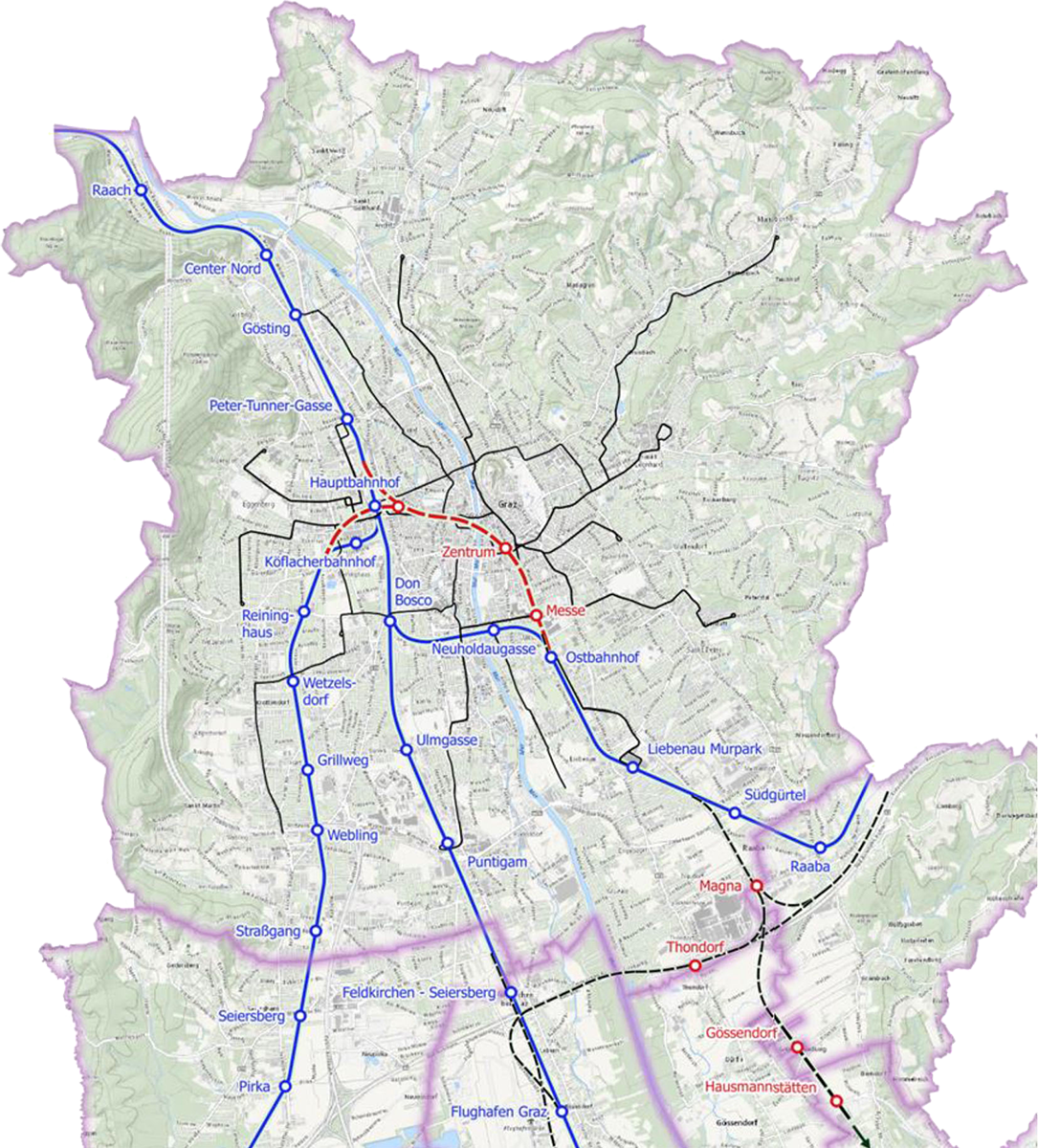 At this point, it is also necessary to ask the structural question once again: does Graz need new transversal or tangential connections for public transport? The S-Bahn is a regional means of transport, suitable for the urbanisation of suburban districts and their connection to the surrounding area – see Paris, Berlin, Munich. In Graz, we must recognise that the city centre is no longer the ultimate destination for all journeys. Instead, everyday life is about accessibility to major institutions such as the Chamber of Commerce, the university and the regional hospital, and about integrating the large residential areas in Waltendorf and St. Peter into the regional context. It is also about counteracting the flourishing and self-reinforcing car system in the suburbs of Graz. In other words, Graz needs an S-Bahn belt in the east of the city, but also east-west connections in the southern urban areas. Against this backdrop, the transverse City Tunnel does not contribute to a forward-looking urban structure.