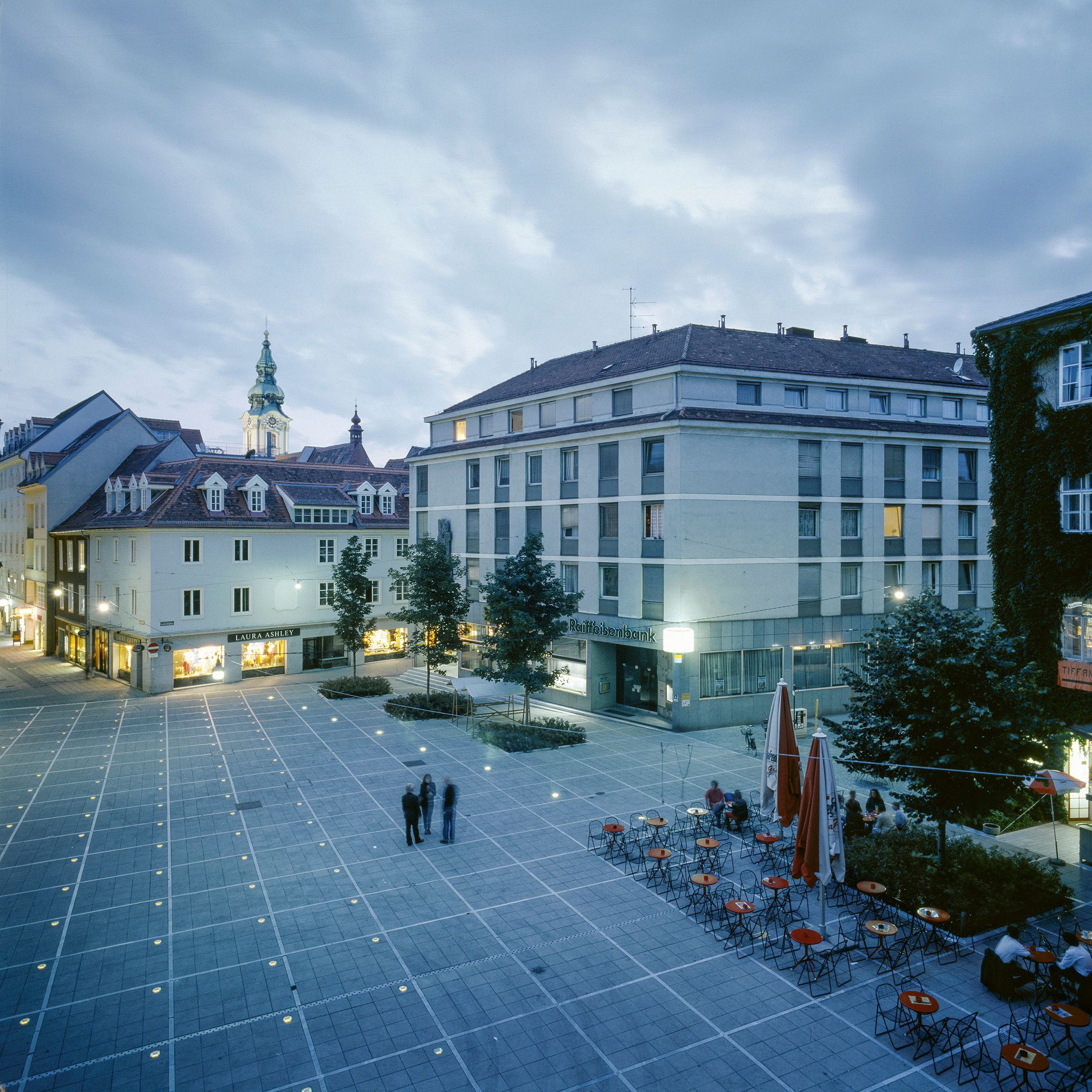 "Everyone knows it because it is so different from other squares. It is not cosy, it is not flat, it partly extends into the façades, it is almost unattractive and therefore somewhat elitist, it demands action. It is a square, a very urban square, in a built-up environment. Its grid is structured and shaped, and it has two faces – one for the day and one for the night." Text: Geramb Dankzeichen 1994. Photo: © Paul Ott